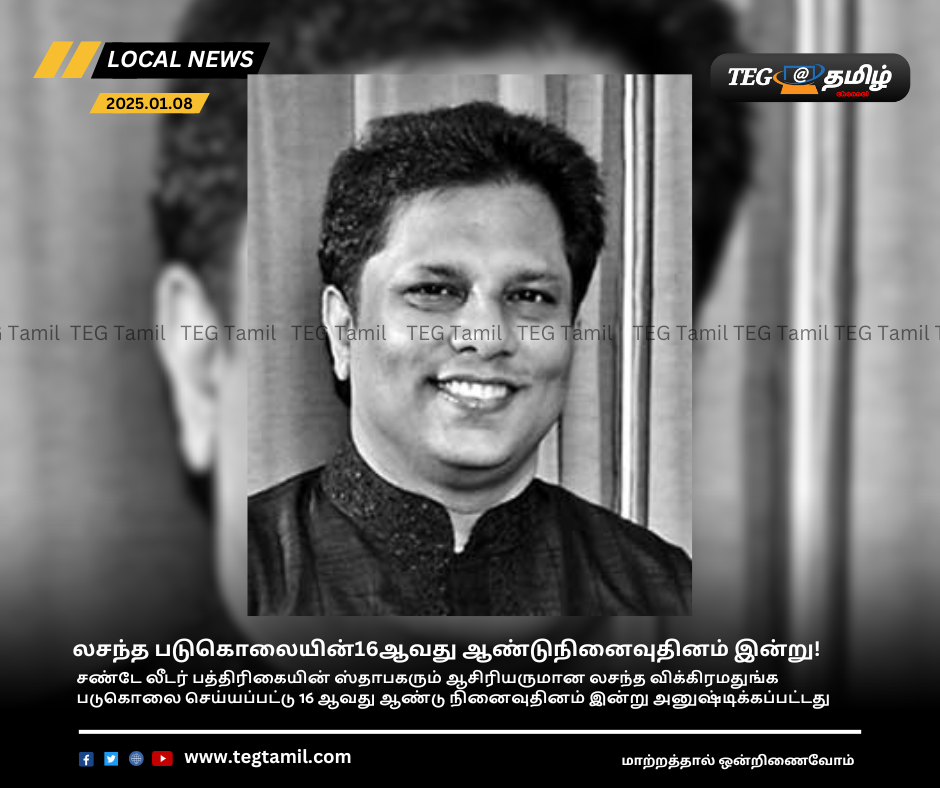 சண்டே லீடர் பத்திரிகையின் ஸ்தாபகரும் ஆசிரியருமான லசந்த விக்கிரமதுங்க படுகொலை செய்யப்பட்டு 16 ஆவது ஆண்டு நினைவுதினம் இன்று அனுஷ்டிக்கப்பட்டது.