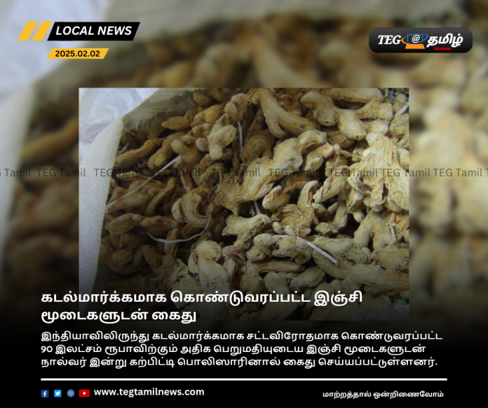இந்தியாவிலிருந்து கடல்மார்க்கமாக சட்டவிரோதமாக கொண்டுவரப்பட்ட 90 இலட்சம் ரூபாவிற்கும் அதிக பெறுமதியுடைய இஞ்சி மூடைகளுடன் நால்வர் இன்று கற்பிட்டி பொலிஸாரினால் கைது செய்யப்பட்டுள்ளனர்.