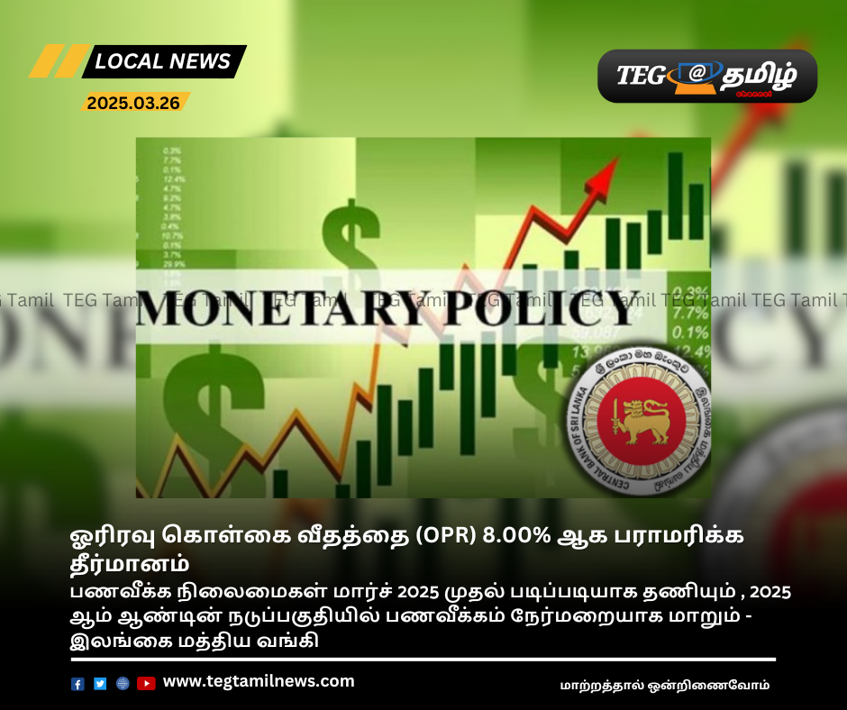 இலங்கை மத்திய வங்கி ஓரிரவு கொள்கை வீதத்தை (OPR) 8.00% ஆக பராமரிக்க நேற்று இடம்பெற்ற இலங்கை மத்திய வங்கியின் நாணயக் கொள்கைச் சபை கூட்டத்தில் தீர்மானம் மேற்கொள்ளப்பட்டுள்ளது.