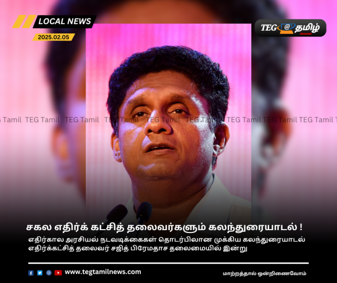 பாராளுமன்ற விவகாரங்கள் உட்பட எதிர்கால அரசியல் நடவடிக்கைகள் தொடர்பிலான முக்கிய கலந்துரையாடலொன்று எதிர்க்கட்சியைப் பிரதிநிதித்துவப்படுத்தும் சகல கட்சித் தலைவர்களின் பங்கேற்புடன் எதிர்க்கட்சித் தலைவர் சஜித் பிரேமதாச தலைமையில் இன்று (05) பாராளுமன்றத்தில் அமைந்துள்ள எதிர்க்கட்சித் தலைவர் அலுவலகத்தில் நடைபெற்றது.