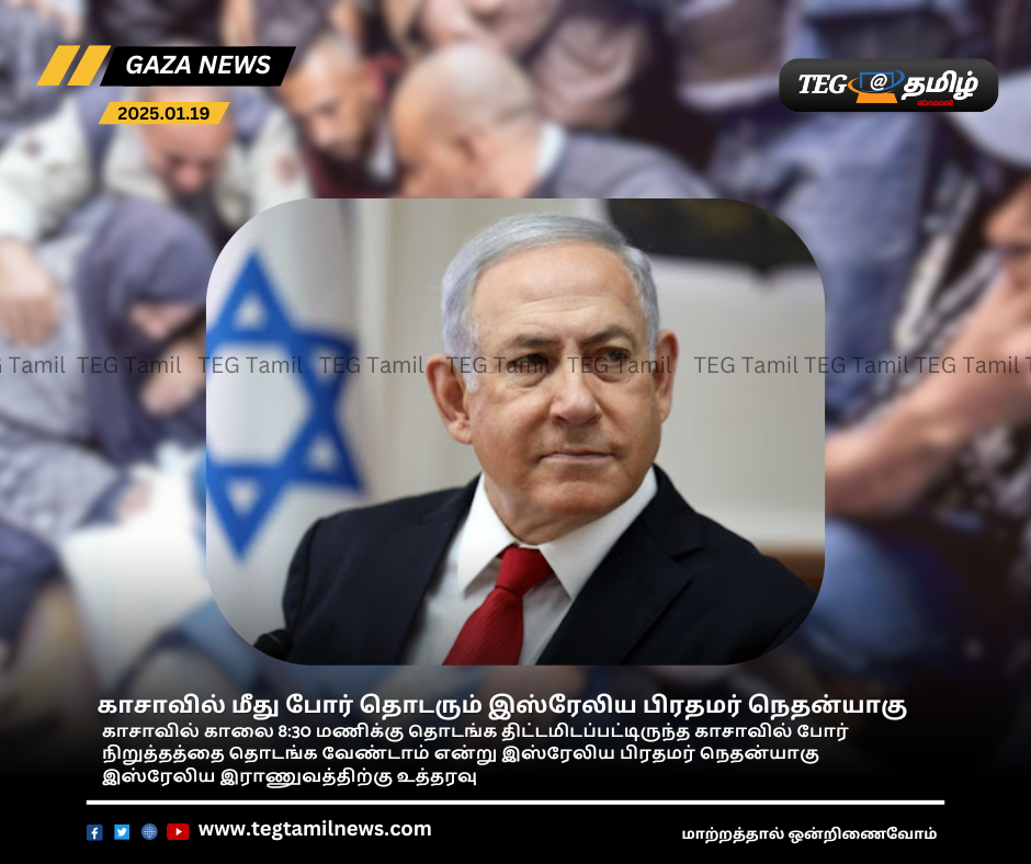 காசாவில் காலை 8:30 மணிக்கு தொடங்க திட்டமிடப்பட்டிருந்த காசாவில் போர் நிறுத்தத்தை தொடங்க வேண்டாம் என்று இஸ்ரேலிய பிரதமர் நெதன்யாகு இஸ்ரேலிய இராணுவத்திற்கு உத்தரவு