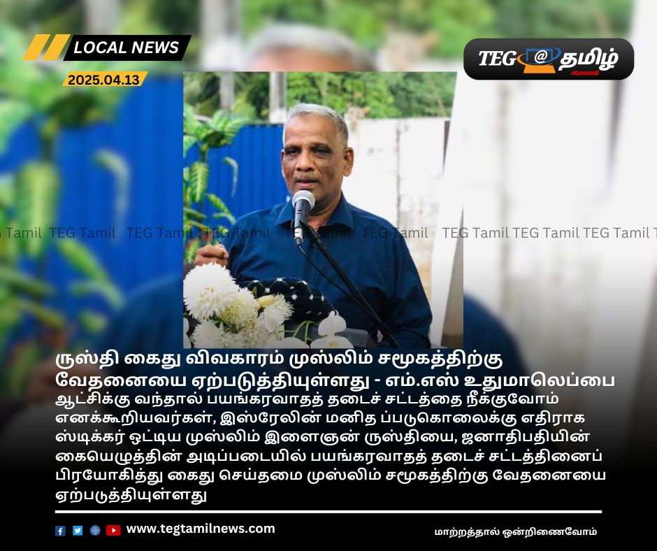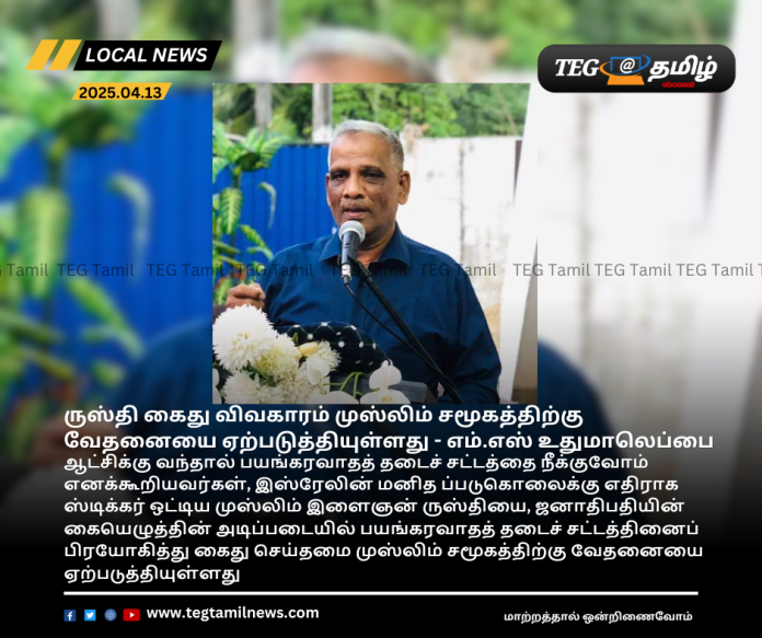 தாங்கள் ஆட்சிக்கு வந்தால் பயங்கரவாதத் தடைச் சட்டத்தை நீக்குவோம் எனக்கூறியவர்கள் இஸ்ரேலின் மனிதப் படுகொலைக்கு எதிராக ஸ்டிக்கர் ஒட்டிய முஸ்லிம் இளைஞன் ருஸ்தியை பயங்கரவாதத் தடைச் சட்டத்தினைப் பிரயோகித்து கைது செய்தமை முஸ்லிம் சமூகத்திற்கு வேதனையை ஏற்படுத்தியுள்ளது எனப் பட்டலந்த வீடமைப்புத் திட்டத்தில் உள்ள சித்திரவதைக் கூடங்கள், சட்டரீதியற்ற தடுப்பு நிலையங்களை நிறுவுதல், பராமரித்தல் ஆகியவற்றை விசாரணை செய்த ஆணைக்குழுவின் அறிக்கை தொடர்பான விவாதம் 10 திகதி பாராளுமன்றத்தில் நடைபெற்ற போது அதில் கலந்து கொண்டு உரையாற்றிய போதே முஸ்லிம் காங்கிரஸ் பாராளுமன்ற உறுப்பினர் எம்.எஸ்.உதுமாலெப்பை மேற்படி தெரிவித்தார்.