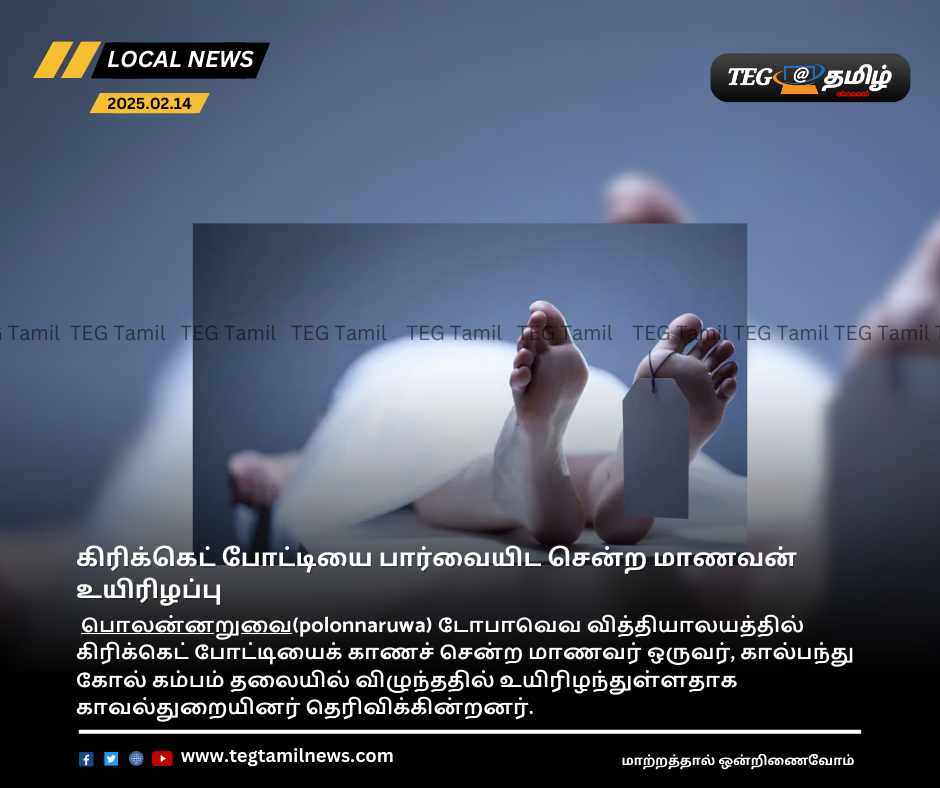 பொலன்னறுவை(polonnaruwa) டோபாவெவ வித்தியாலயத்தில் கிரிக்கெட் போட்டியைக் காணச் சென்ற மாணவர் ஒருவர், கால்பந்து கோல் கம்பம் தலையில் விழுந்ததில் உயிரிழந்துள்ளதாக காவல்துறையினர் தெரிவிக்கின்றனர்.