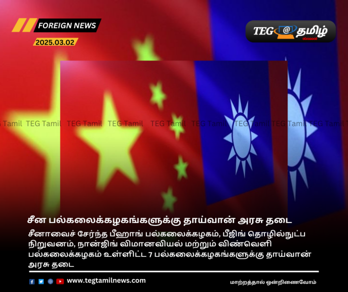 சீனாவைச் சேர்ந்த பீஹாங் பல்கலைக்கழகம், பீஜிங் தொழில்நுட்ப நிறுவனம், நான்ஜிங் விமானவியல் மற்றும் விண்வெளி பல்கலைக்கழகம் உள்ளிட்ட 7 பல்கலைக்கழகங்களுக்கு தாய்வான் அரசு தடை விதித்துள்ளது.
