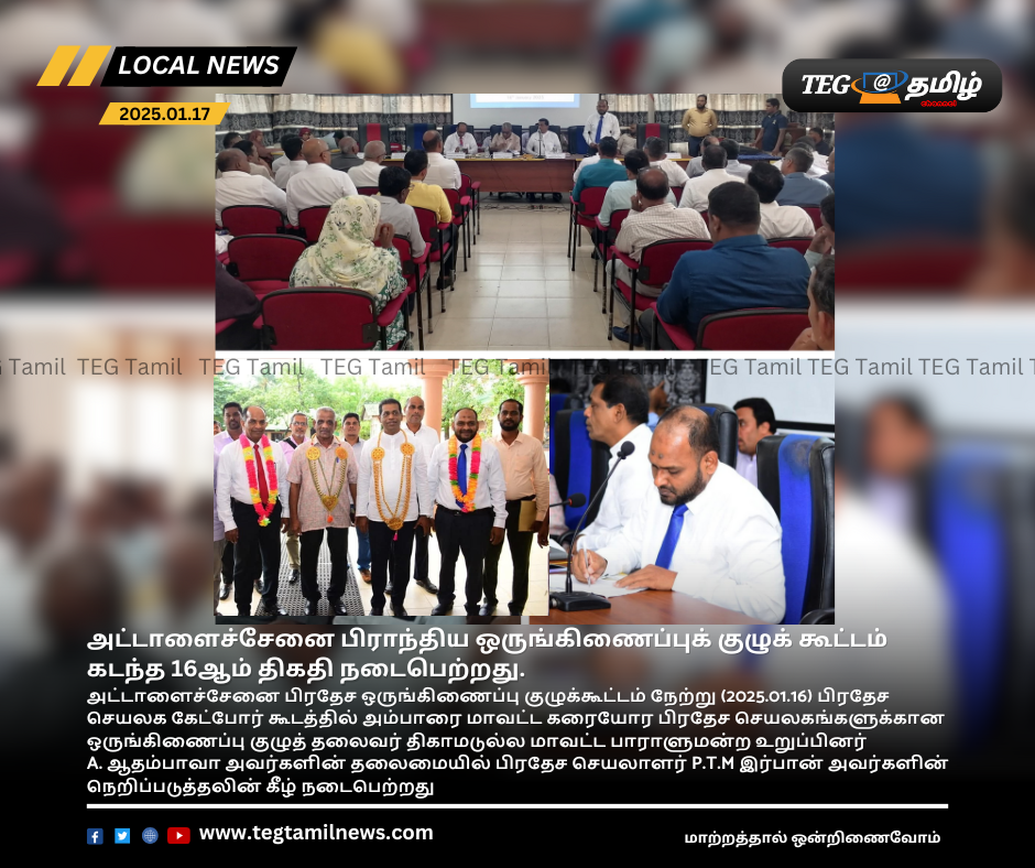 அட்டாளைச்சேனை பிரதேச ஒருங்கிணைப்பு குழுக்கூட்டம் நேற்று (2025.01.16) பிரதேச செயலக கேட்போர் கூடத்தில் அம்பாரை மாவட்ட கரையோர பிரதேச செயலகங்களுக்கான ஒருங்கிணைப்பு குழுத் தலைவர் திகாமடுல்ல மாவட்ட பாராளுமன்ற உறுப்பினர்
