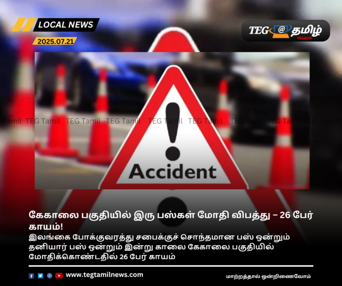 கேகாலையில் இருந்து இரத்தினபுரி நோக்கி பயணித்த தனியார் பஸ், வேரகொடயிலிருந்து கேகாலை நோக்கி பயணித்த இலங்கை போக்குவரத்து சபைக்கு சொந்தமான பஸ்ஸில் மோதியதில் இந்த விபத்து ஏற்பட்டுள்ளது.