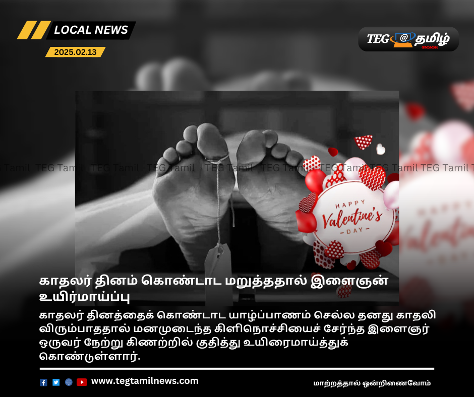 காதலர் தினத்தைக் கொண்டாட யாழ்ப்பாணம் செல்ல தனது காதலி விரும்பாததால் மனமுடைந்த கிளிநொச்சியைச் சேர்ந்த இளைஞர் ஒருவர் நேற்று கிணற்றில் குதித்து உயிரைமாய்த்துக் கொண்டுள்ளார்.
